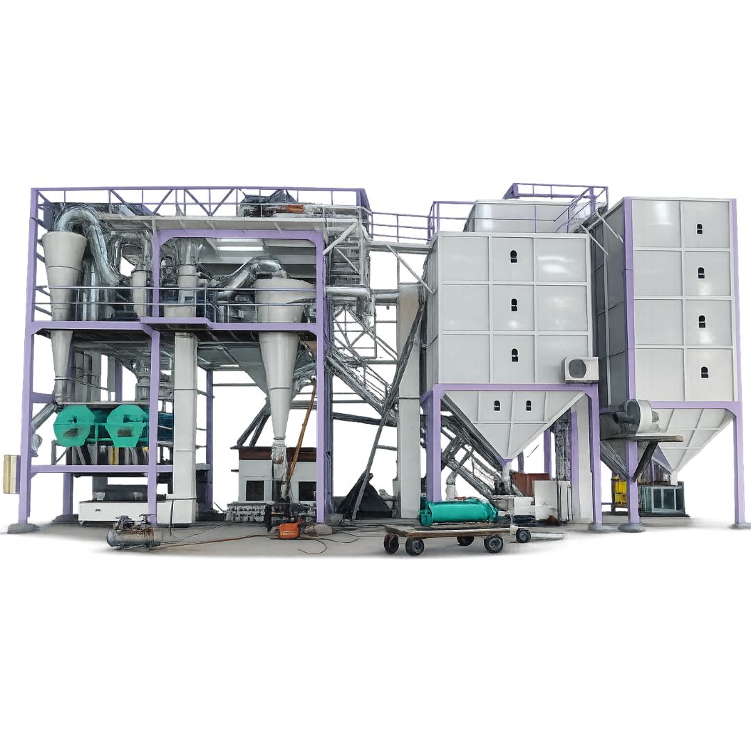The plant processes raw agricultural commodities through multiple stages such as cleaning, grading, and separation. The electric motor-driven system ensures smooth material flow and efficient processing while maintaining product integrity.